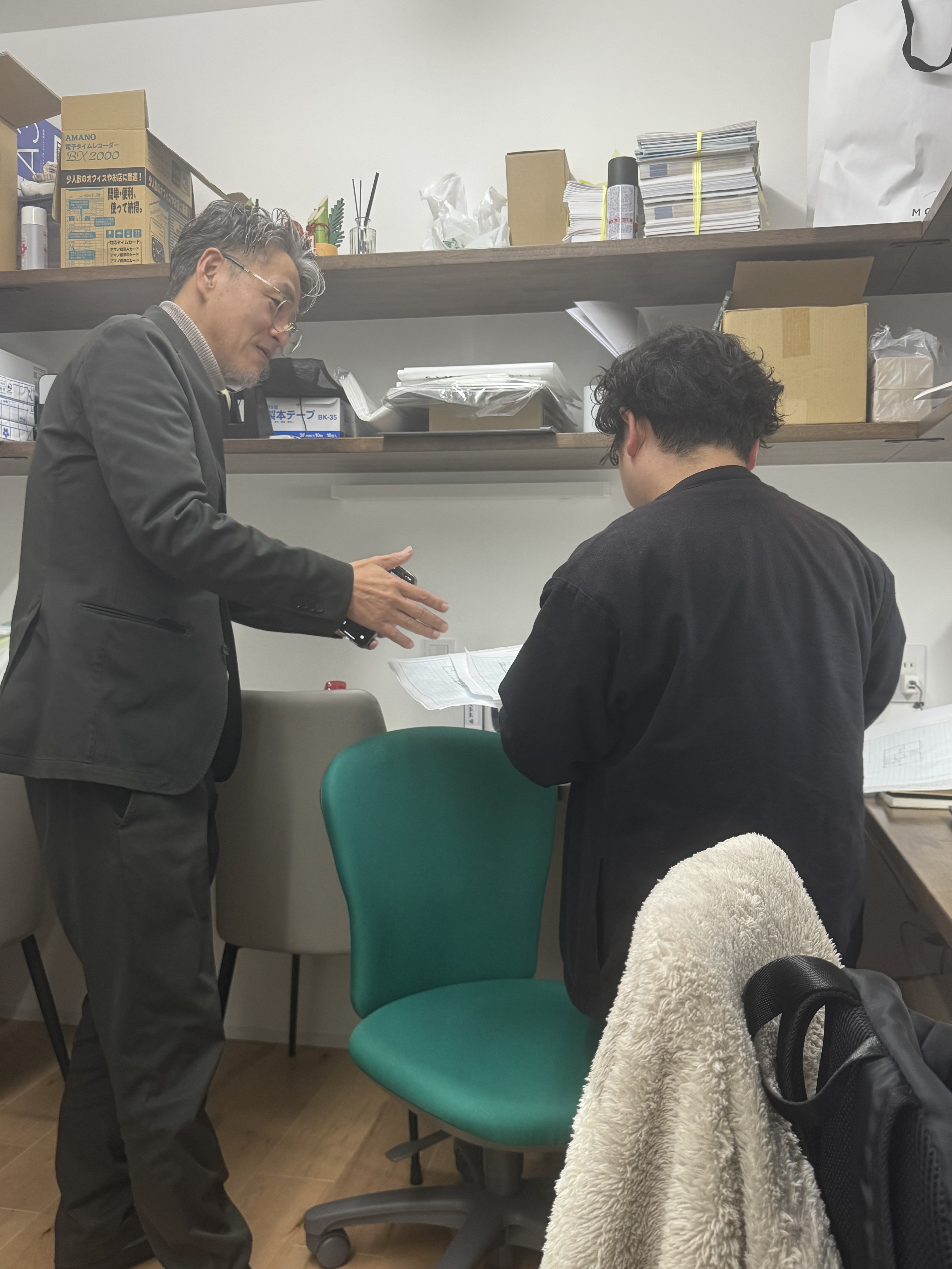 図面に魂を込める社長とだんだんとその魂に近づく石井くん。