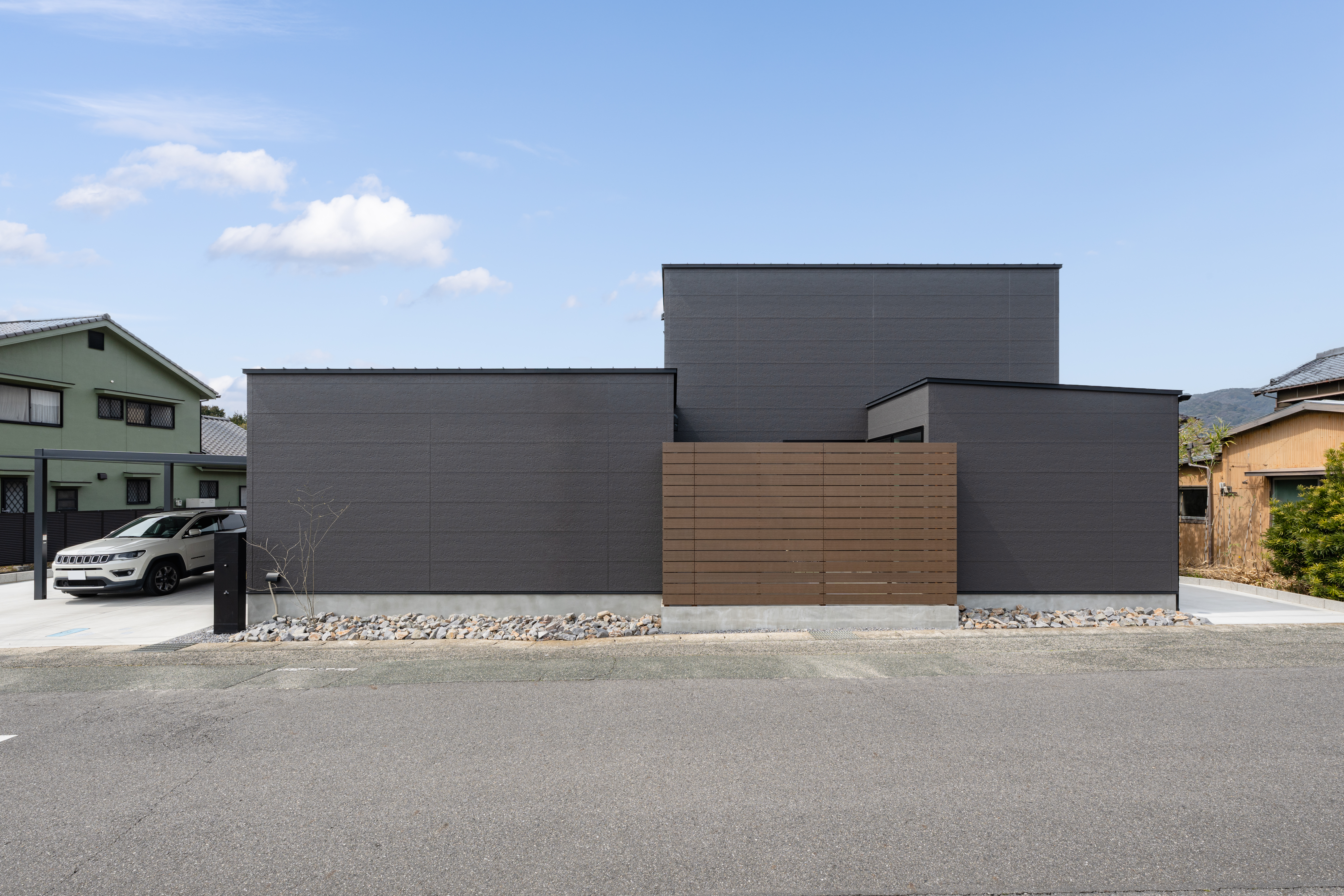 スタイリッシュな外観で、道路側から窓が一つもありませんが、